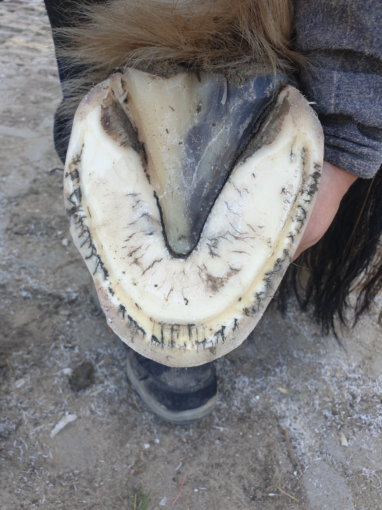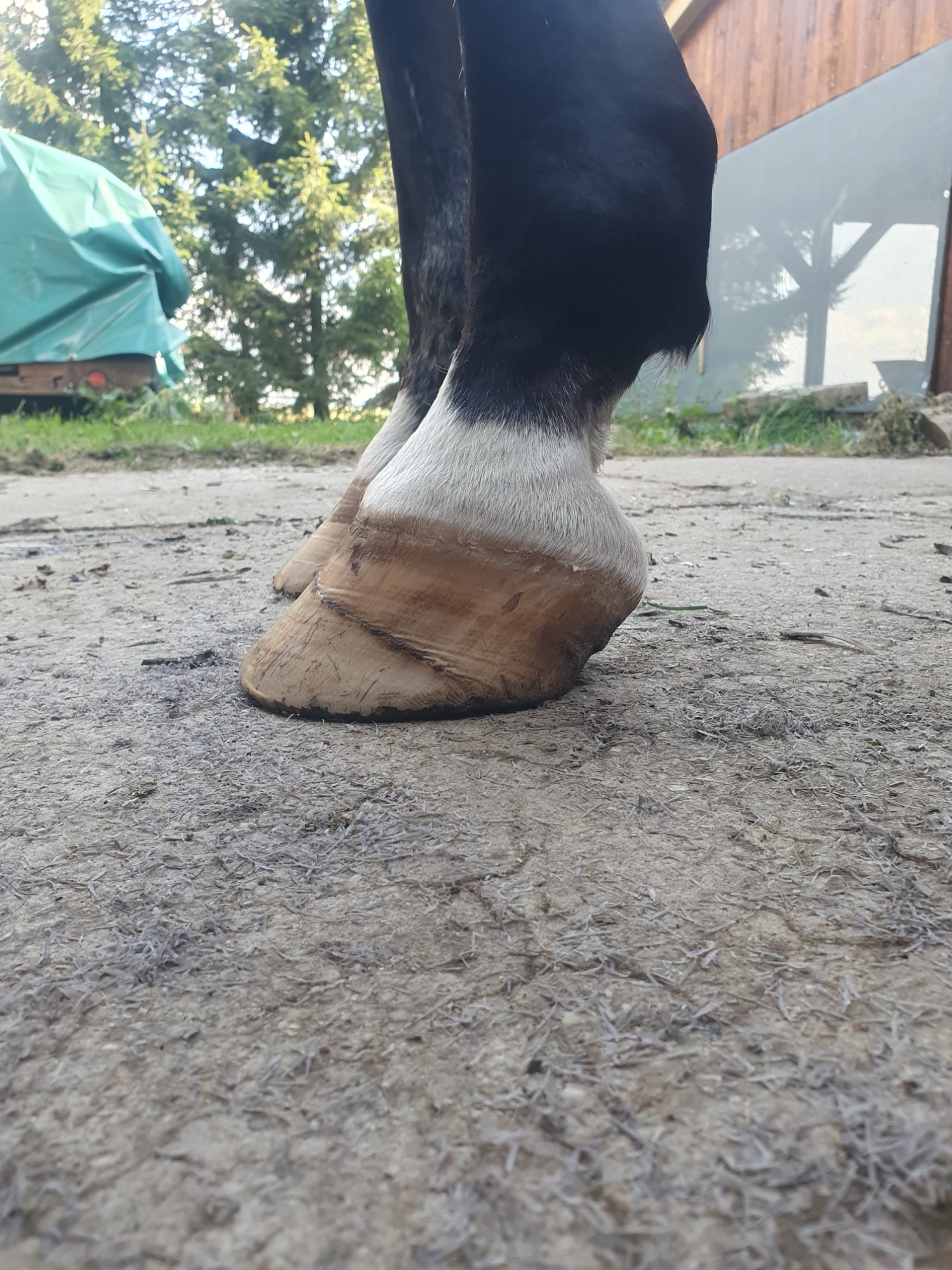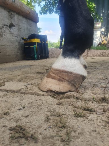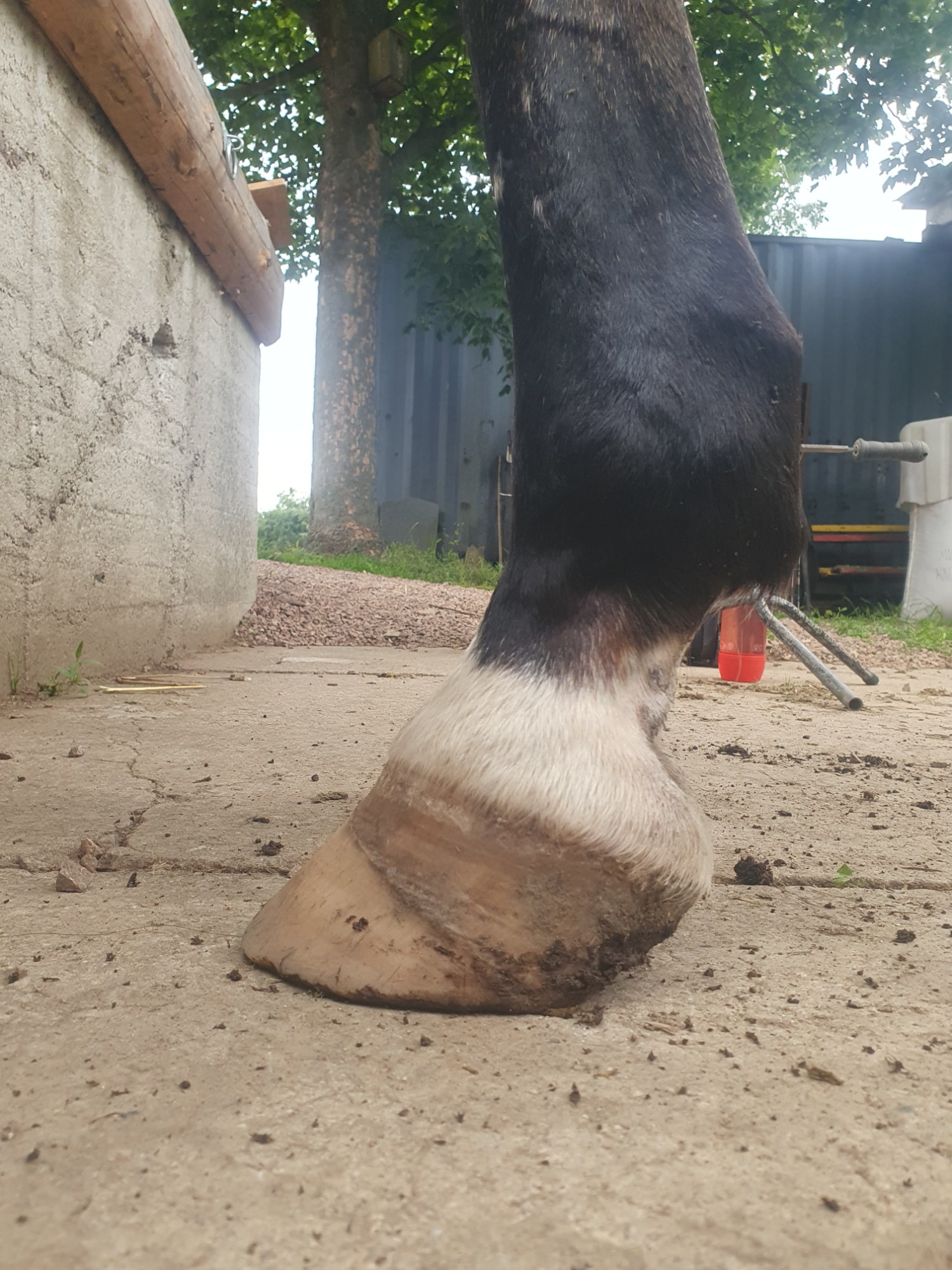 Die letzte Hufbearbeitung war vor meinem ersten Termin ca. 4 Monate her. Durch das starke Hornwachstum und den wenigen Abrieb ist die Zehe dieses Hinterhufes deutlich am hebeln, besonders durch die verbreiterte Blättchenschicht aufgrund von Stoffwechselproblematiken. Durch kurze Bearbeitungsintervalle (max. 6 Wochen) konnten die Hufe wieder in eine funktionale Form gebracht werden.
