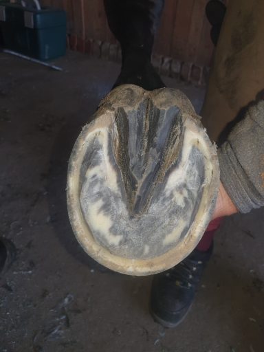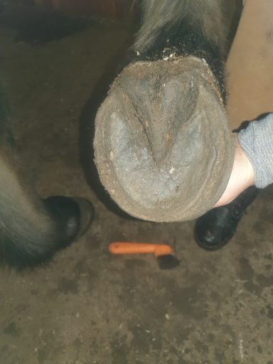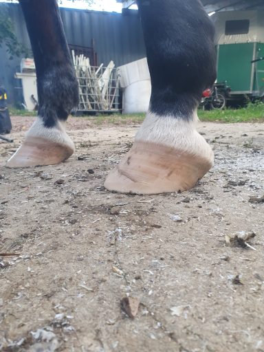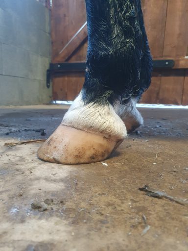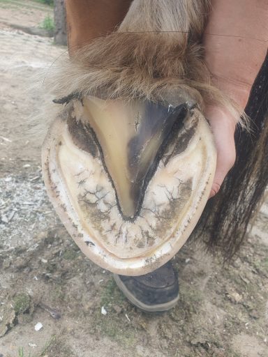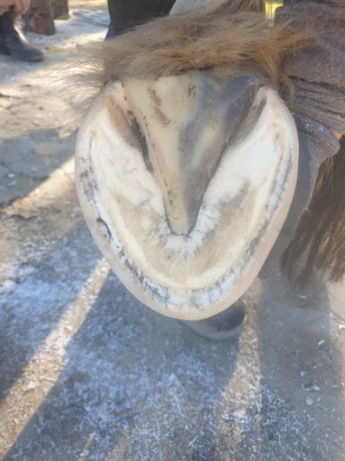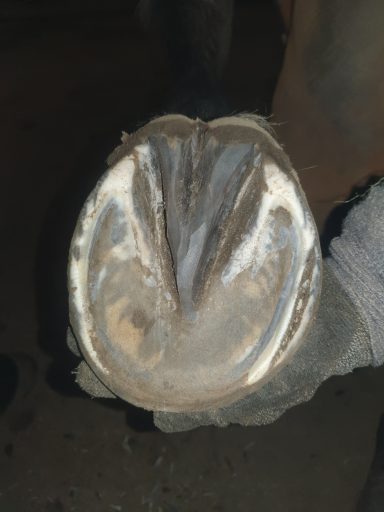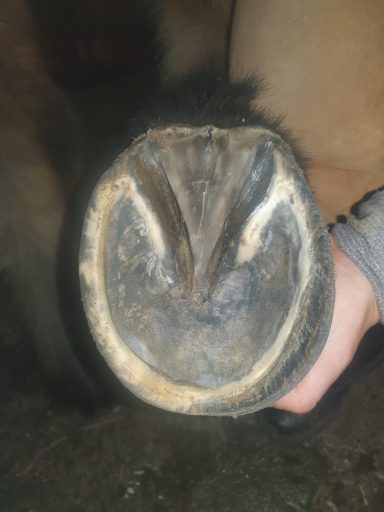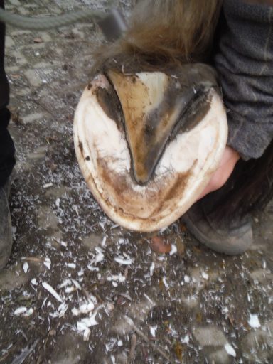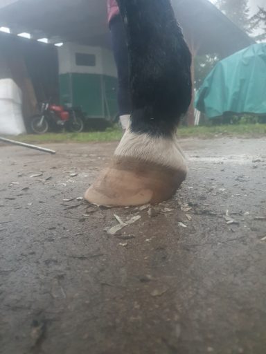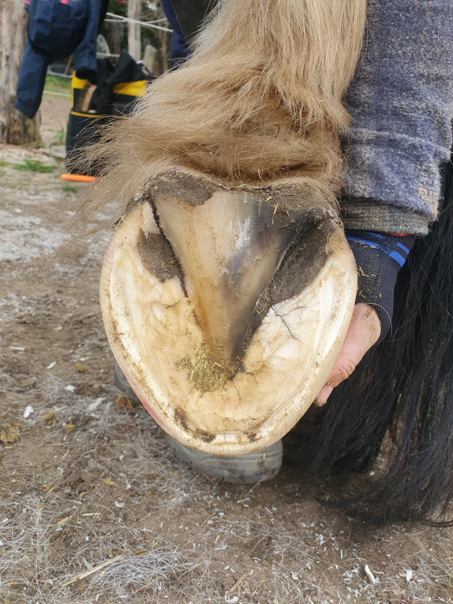Die letzte Hufbearbeitung war vor meinem ersten Termin ca. 4 Monate her. Durch das starke Hornwachstum und den wenigen Abrieb ist die Zehe dieses Hinterhufes deutlich am hebeln, besonders durch die verbreiterte Blättchenschicht aufgrund von Stoffwechselproblematiken. Durch kurze Bearbeitungsintervalle (max. 6 Wochen) konnten die Hufe wieder in eine funktionale Form gebracht werden.