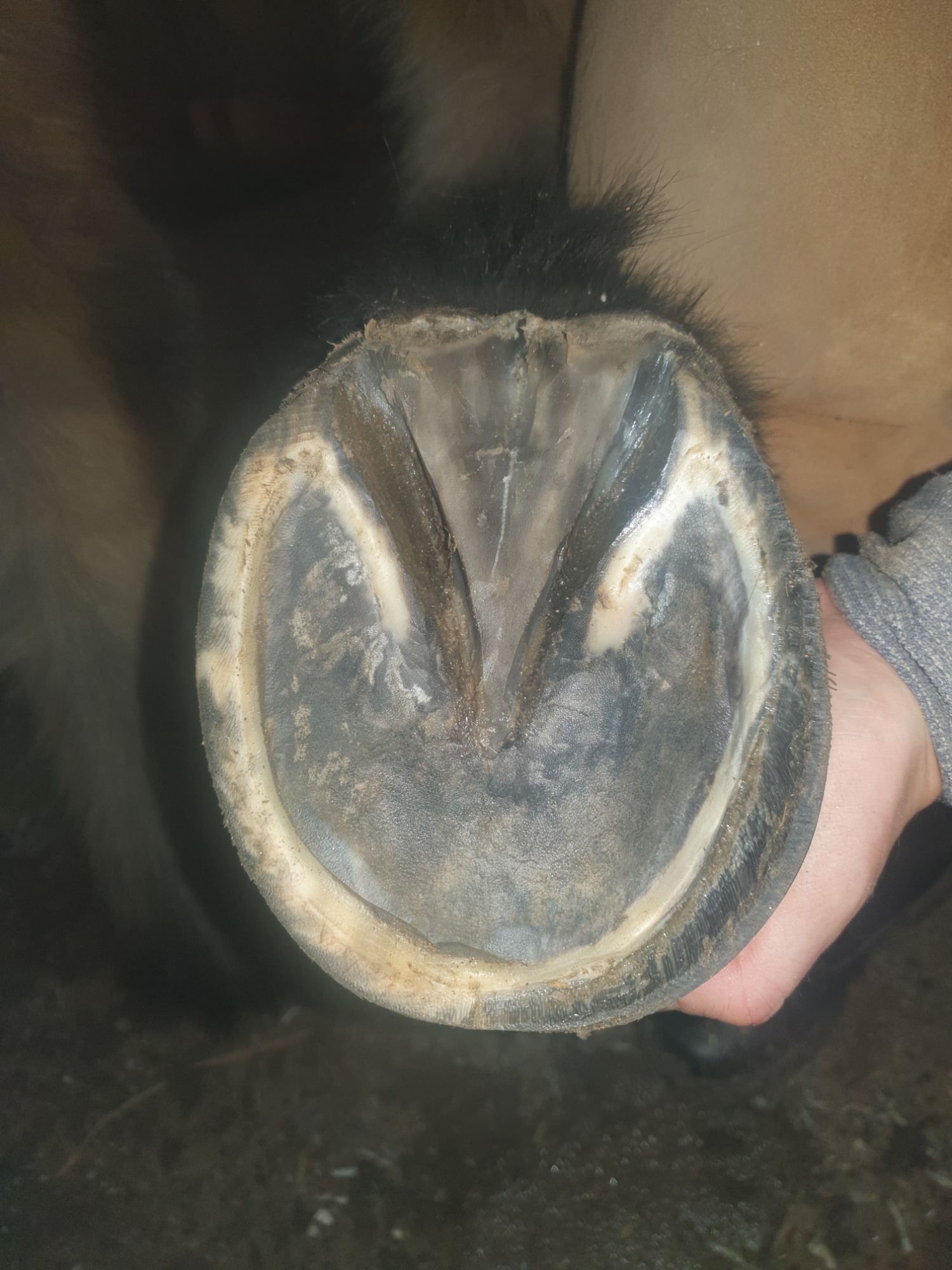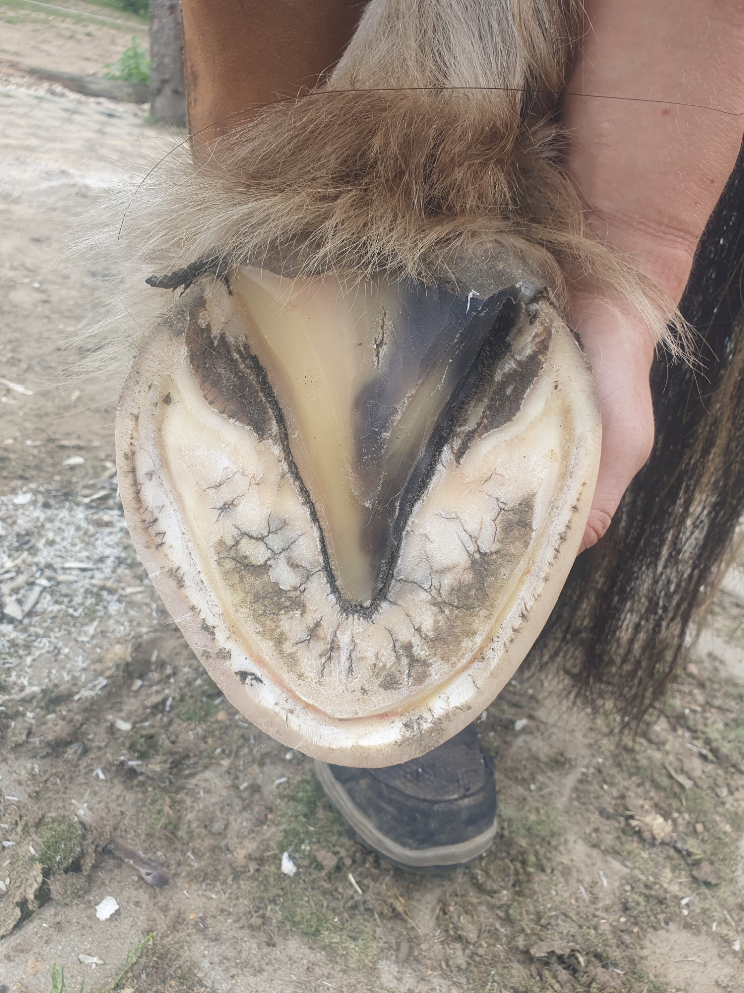 Durch eine starke und langanhaltende Strahlfäule beim Vorbesitzer, hatte dieser Wallach eine Saumbandentzündung entwickelt. Durch die korrekte Pflege konnte diese nach und nach rauswachsen. Bereits beim dritten Termin war die Strahlfäule erfolgreich bekämpft.